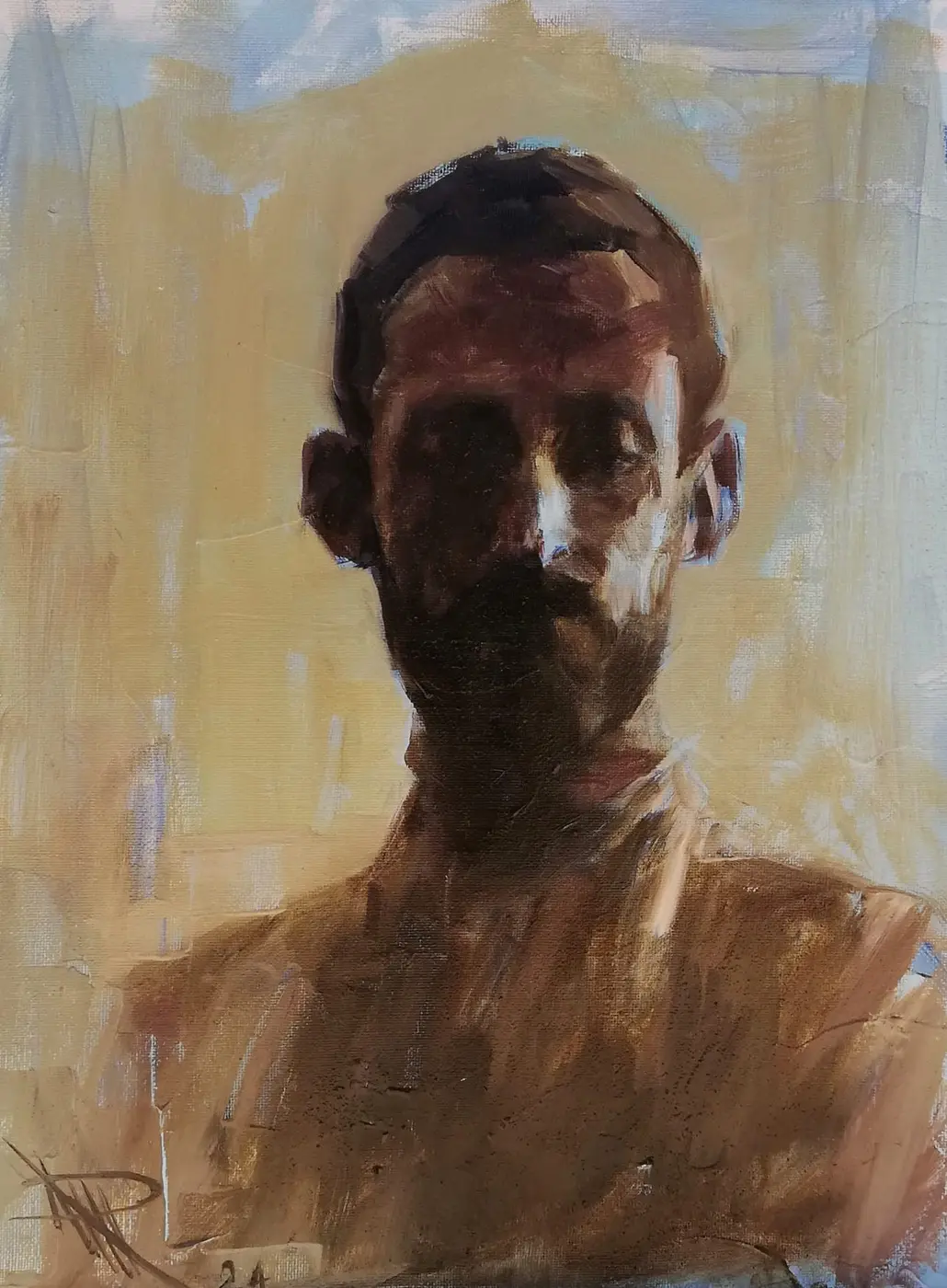 250,00 €“Ritratto in Siena naturale” – Alex Preti, olio su cartone telato, 30×40 cm, anno 2024